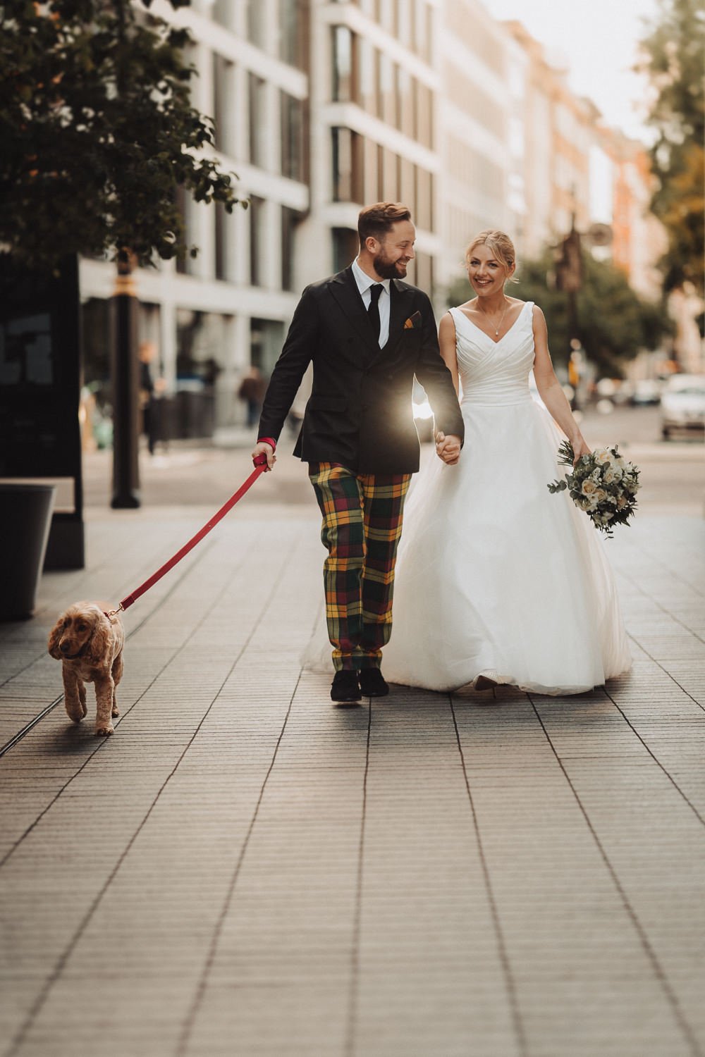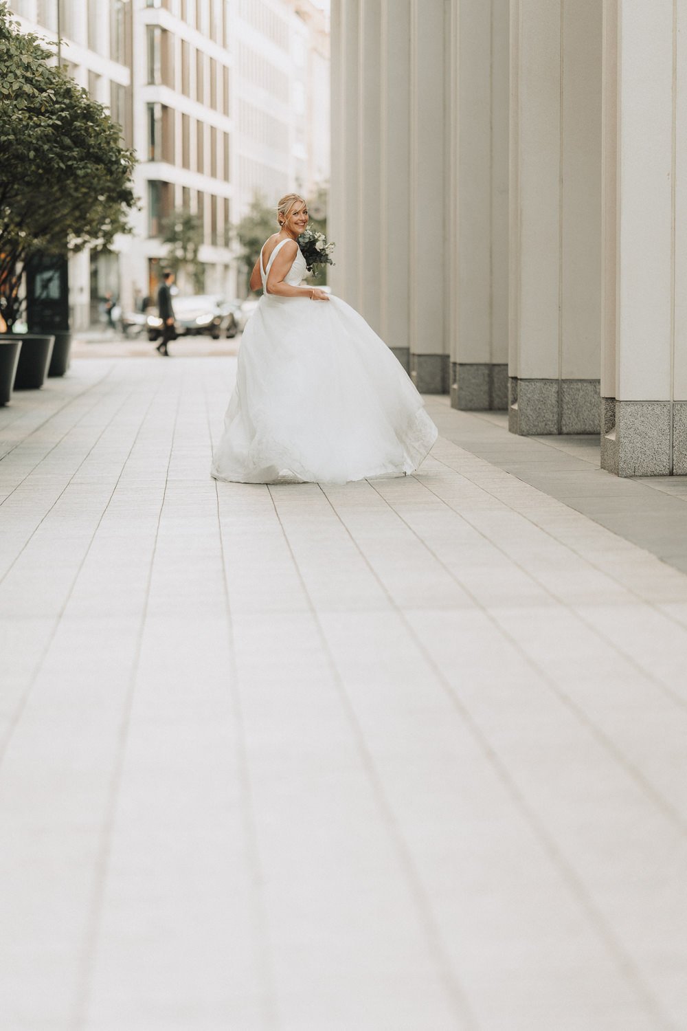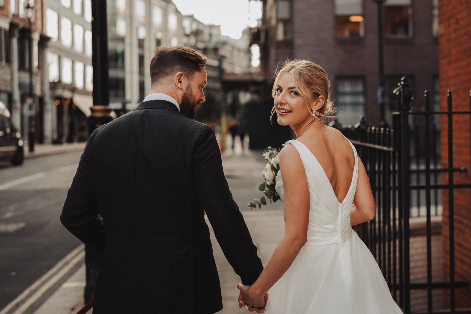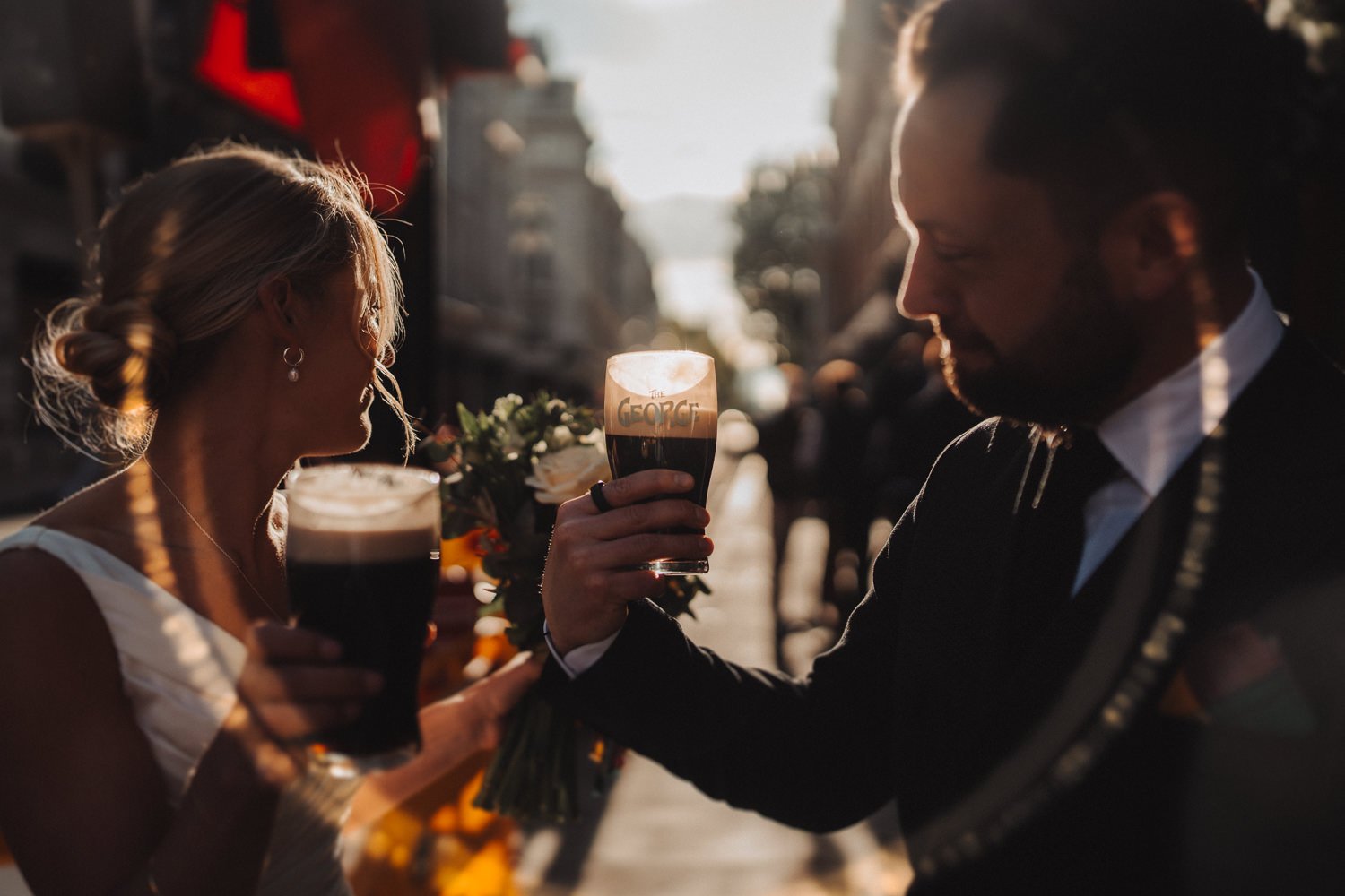 With golden-hour light streaming through the city streets, we captured some effortlessly stylish portraits before everyone settled into a night of merriment and toasts
